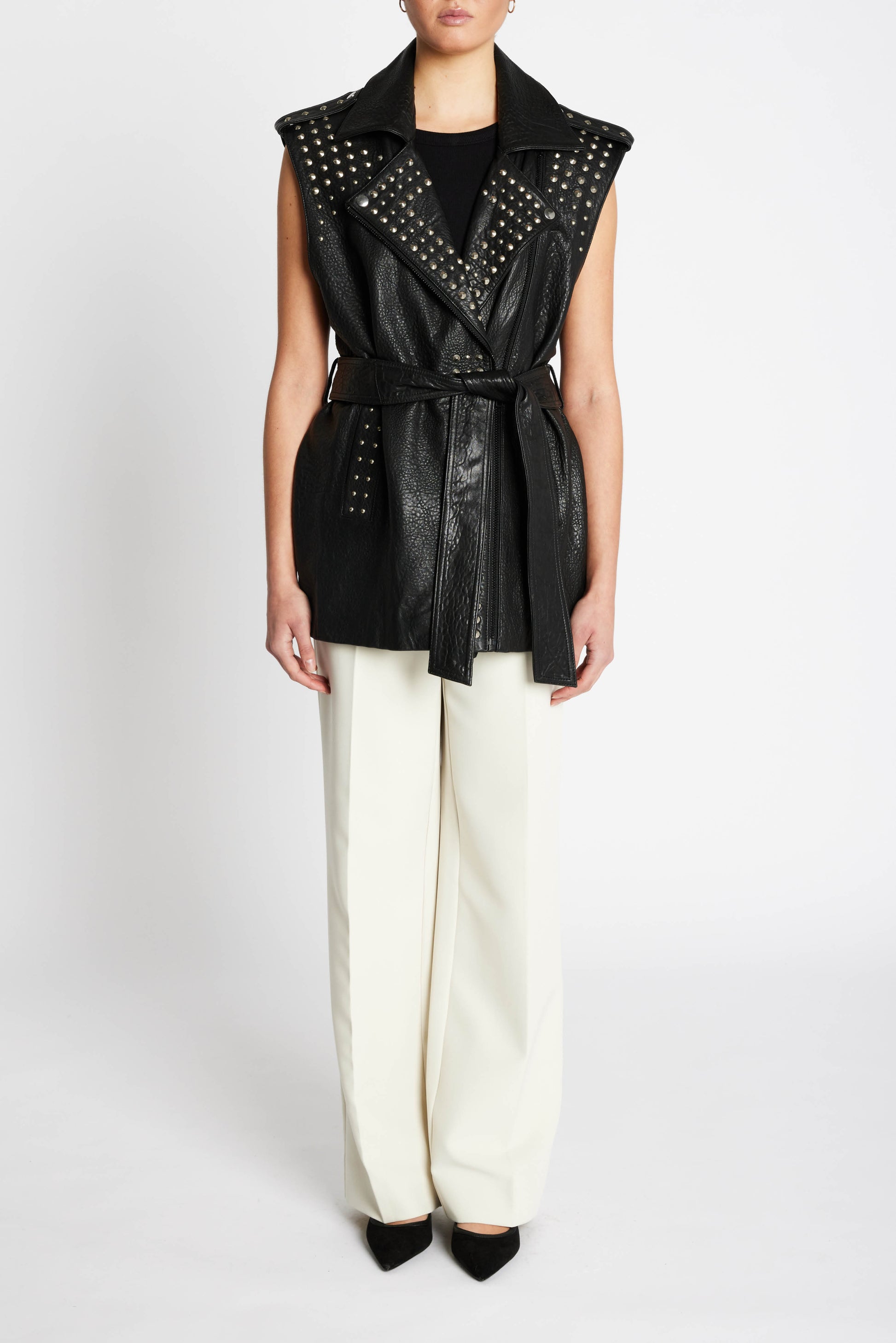 The Bruuns Bazaar Clove Zhoa Leather Waistcoat is crafted from 100% genuine leather, featuring a sharp lapel collar, decorative studs, and a sleek longline silhouette. Sleeveless and bold, it’s a statement piece with an edgy twist.