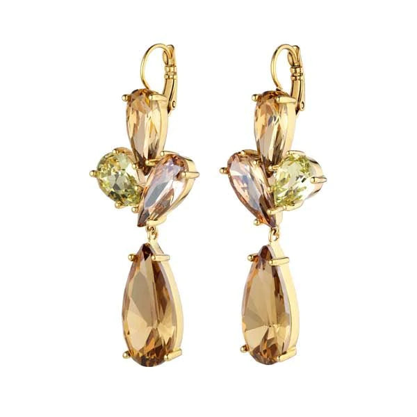 AMY - A fashionable and beautiful statement French hook earring that really stands out with its three large hand-cut and facetted hand-set crystals and a dazzling facetted drop-shaped crystal pendant. The earring is made in polished brass and has a quality plating. Here shown in a gold-tone version and multi pastel-toned crystals.