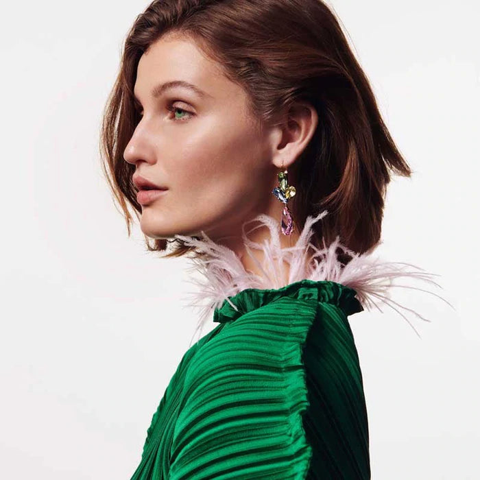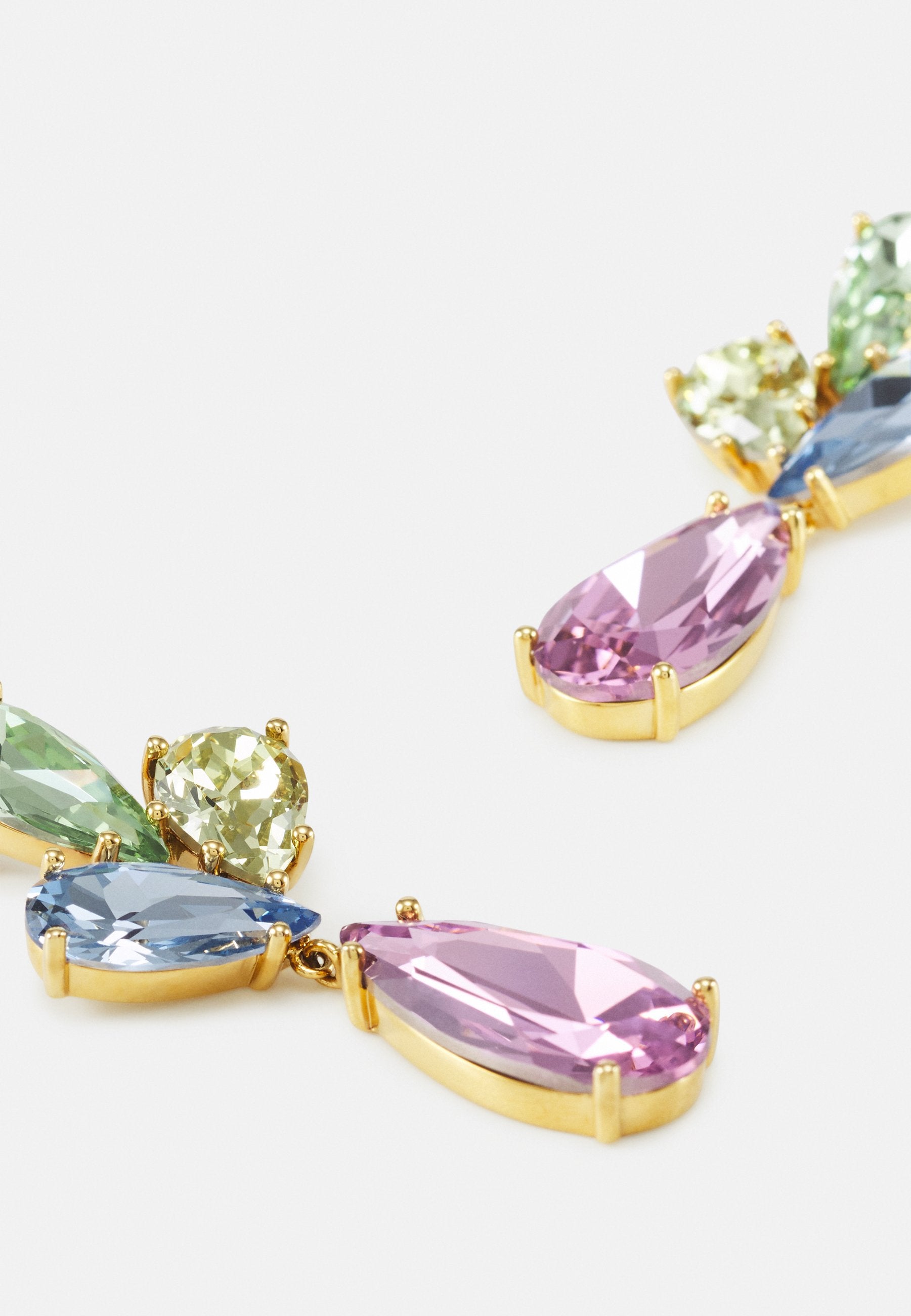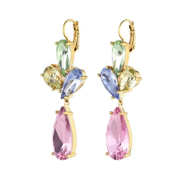 AMY - A fashionable and beautiful statement French hook earring that really stands out with its three large hand-cut and facetted hand-set crystals and a dazzling facetted drop-shaped crystal pendant. The earring is made in polished brass and has a quality plating. Here shown in a gold-tone version and multi pastel-toned crystals.