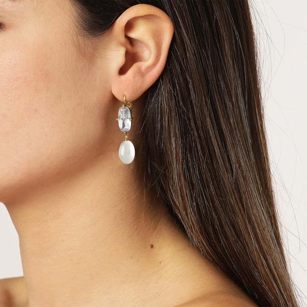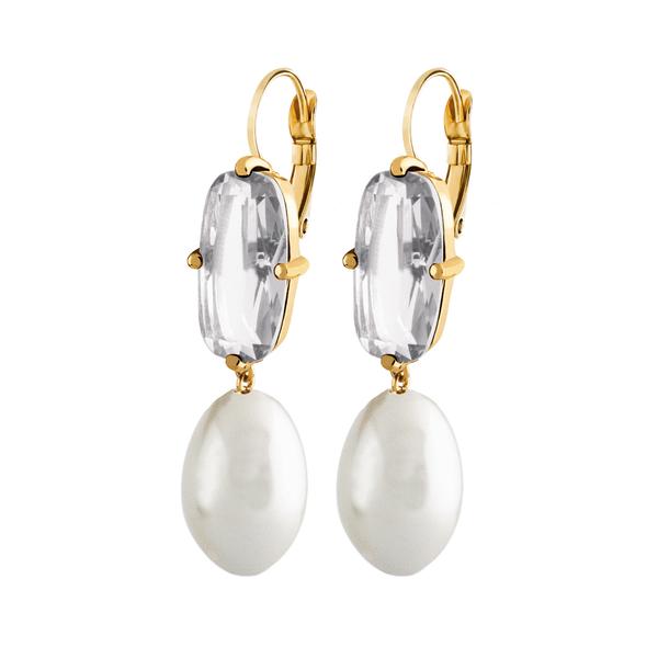 ANITA - Classic french hook earring with a rectangular facet cut crystal stone handset into the setting and a baroque pearl pendant. Wear day or evening, a truly versatile piece. Here shown in a clear crystal /white pearl and silver-tone version. Danish design, nickel free.