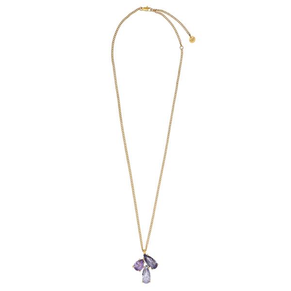AVIRA - A fashionable and beautiful necklace that really stands out with its three large hand-cut and facetted handset crystals. The necklace is made in polished brass and has a quality plating. Here shown in a gold-tone version and lavender/violet toned crystals.
