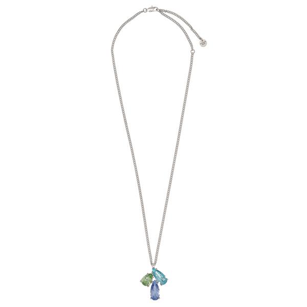 AVIRA - A fashionable and beautiful necklace that really stands out with its three large hand-cut and facetted handset crystals. The necklace is made in polished brass and has a quality plating. Here shown in a silver-tone version and aqua /blue-toned crystals.