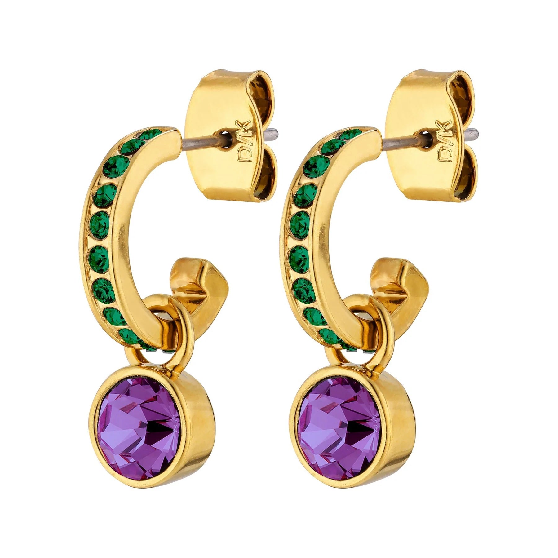 DESSA is destined to be an all time classic in our collection: A detachable larger round facetted crystal pendant drops from a wonderful small hoop fully encrusted with handset facetted crystals. Wear with or without the crystal pendant - either or, the style is everlasting. Hoop (about 18 mm in diameter) and pendant are made in polished brass. Post made in surgical steel. Here shown in a combination of a mysterious purple crystal pendant and golden crystals on hoop in gold tone base. Handmade, nickel free Danish design.