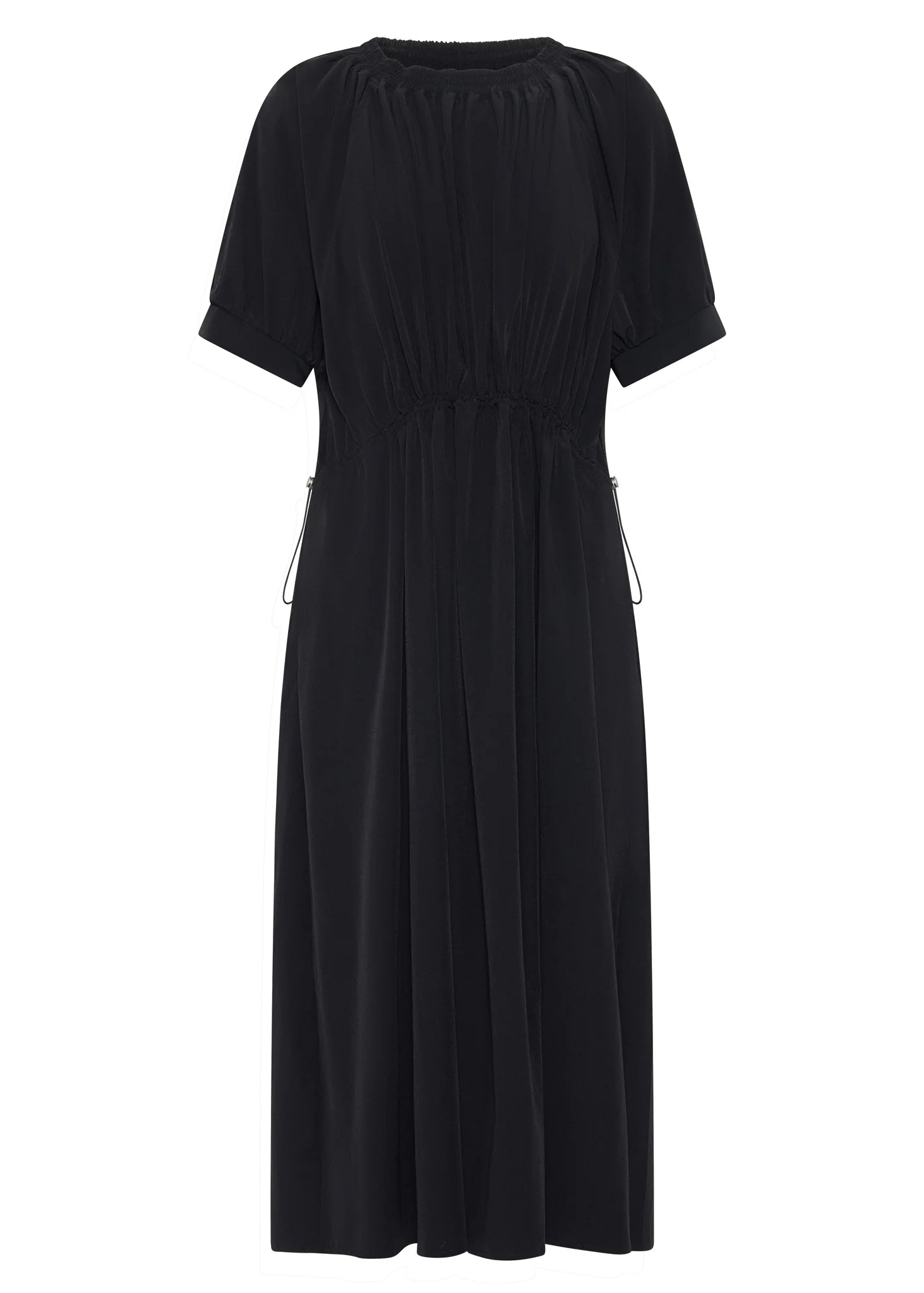 The Tech Drawcord Dress features a fun new silhouette in a technical fabrication.